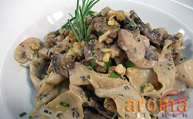 Mixed mushroom and walnut pappardalle with rosemary cream