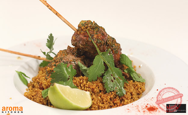 Moroccan beef skewers, with charmuola vinaigrette and curried couscous salad