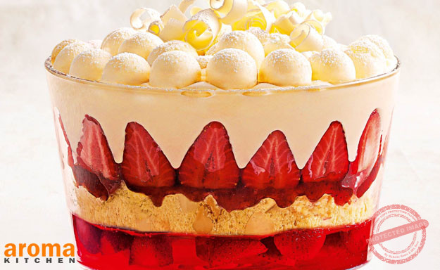 Start this recipe by placing half of the cake pieces into the bottom of the trifle bowl. Soak the sponge with half of the sherry. Heat up the jam with 2 tablespoons of water to soften, then pour half over the cake. Allow to cool slightly while you whip the cream with vanilla essence. Next, scatter half of the whole strawberries over the sponge and pour over half of the custard. Next, spoon over half of the whipped cream and even out. Repeat the whole process again with the remaining ingredients. Finish off with a few strawberries on top and white chocolate shavings