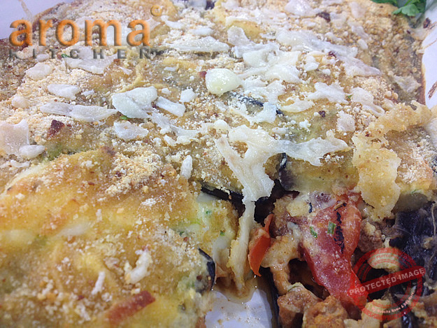 Slice the auberigine and tomatoes, grill them and set aside. Fry the onion, garlic and cumin on high heat, add the lamb mice and the polpa, leave it to simmer and season to taste. Set aside to cool off, add one raw egg and mix. Start layering an ovenproof dish, first with the auberigine, than the lamb mix, followed by the fresh tomatoes, gbejna and another layer of auberigine. Mix the cream with the two eggs and Parmesan, spread over the top and finish with breadcrumbs. Bake for 35 minutes in a hot oven at 200`c.