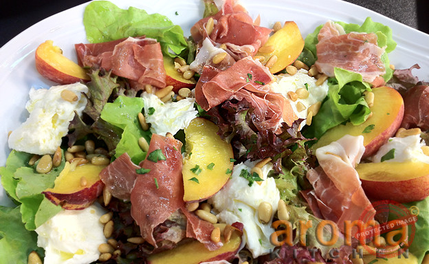 Mozzarella salad with Parma ham, peaches and maple syrup drizzle