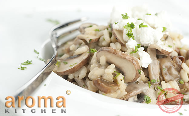 In a small saucepan, heat the chicken stock and bring to a simmer. In a heavy-bottomed pot or pan, pour the butter substitute and sauté the pancetta and onions over medium-low heat for 5 minutes. Add the sliced mushrooms and sauté for another 5 minutes. Add the rice and stir to coat the grains with the butter substitute. Add the wine and cook for 2 minutes. Add 2 full ladles of the chicken stock mixture to the rice plus the saffron, salt, and pepper. Stir and simmer over low heat until the stock is absorbed, 5 to 10 minutes. Continue to add the stock mixture, 2 ladles at a time, stirring every few minutes. Each time, cook until the mixture seems a little dry before adding more of the stock mixture. Continue until the rice is cooked through, but still al dente, about 25 to 30 minutes in total. When done, the risotto should be thick and creamy in consistency. Remove from the heat and stir in the Parmesan cheese. Serve hot in bowls with extra cheese.