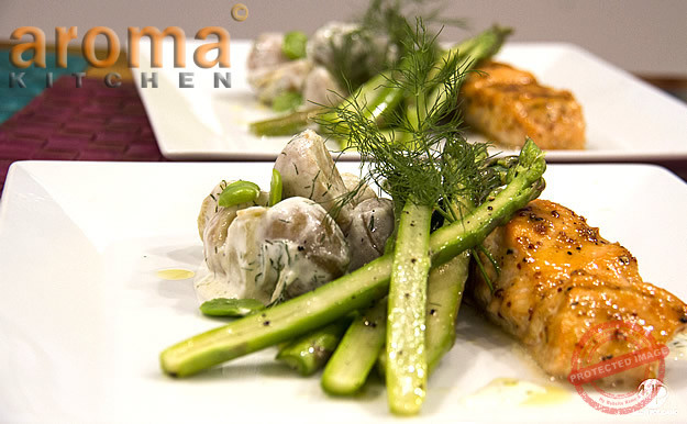 Mustard glazed salmon fillets with creamy dill new potatoes