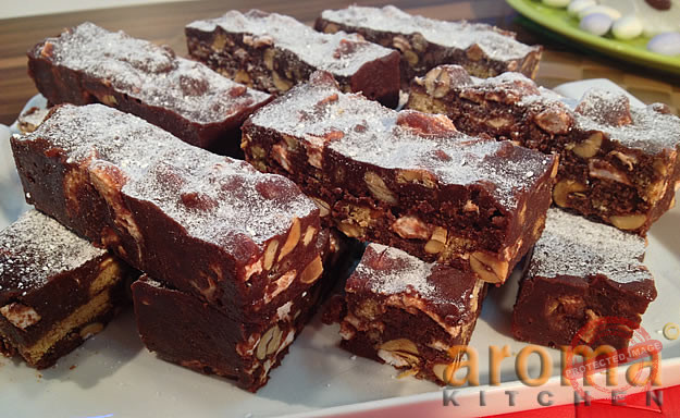 Melt the butter, chocolate and golden syrup and rum in a heavy-based saucepan. Scoop out about 125ml of this melted mixture and put to one side. Put the biscuits into a freezer bag and then bash them with a rolling pin. You are aiming for both crumbs and pieces of biscuits. Fold the biscuit pieces and crumbs into the melted chocolate mixture in the saucepan, and then add the marshmallows and toasted peanuts. Tip into a 22cm square tin lined with non-stick paper and flatten as best you can with a spatula. Pour the reserved 125ml of melted chocolate mixture over the marshmallow mixture and smooth the top. Refrigerate for about 2 hours or overnight. Cut into 24 fingers and dust with icing sugar before serving.