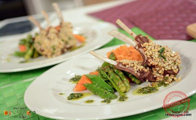 Start this recipe by seasoning the lamb with salt and pepper. Heat the oil in a pan and seal the lamb on both sides for a few minutes. Remove from the pan and brush all over with mustard. Press the chopped almonds on top, place into a baking tray and drizzle with a little oil. Continue in the oven at 200`c for about 8-10 minutes. Meanwhile cook the potatoes in boiling water till soft. Drain away the water and crush the sweet potatoes with the butter and coriander and season with salt and pepper. Next prepare the salsa verde by pulsing everything together in a food processor. To serve, remove the cooked lamb from the oven and allow to rest for a few minutes. Cut into 4 pieces. Spoon the crushed sweet potatoes in the middle of 2 serving plates and lay on the cooked vegetables. Arrange 2 pieces of nutty lamb cutlets onto each plate and drizzle over the sasla verde.