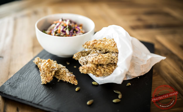 Start this recipe by preparing the chicken. In a medium mixing bowl, place the minced ginger and garlic, corn flour, cayenne pepper, oregano, egg, soy sauce and season with salt and pepper. Mix together, then add in the chicken strips and mix to coat all over. For the oat crust, place ½ of the porridge oats into a food processor and pulse for a few seconds to chop. Tip the oats into a large plate and mix in the remaining half porridge oats, parsley and season with salt and pepper. Dip the chicken strips into the oat mixture and coat al over. Place the chicken onto a lined baking tray and drizzle with olive oil. Bake in the oven at 200`c for 10 minutes until golden brown. Meanwhile, prepare the coleslaw by mixing together the dressing ingredients. Pace the extra virgin olive oil, white wine vinegar, lemon juice, garlic and Dijon mustard into a large bowl and season well with salt and pepper. Whisk together well then add in the cabbage, carrots, pumpkin seeds and parsley and mix together well. When ready, serve the cooked oat crusted chicken strips with the healthy coleslaw on the side.