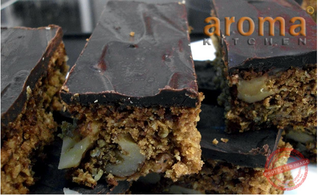 Oatmeal ginger bread with walnuts and rich chocolate topping