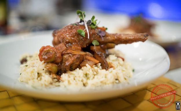 Remove from the pan and add the diced onions, garlic and carrots, sauté until browned than add the olives and anchovies. Add the rabbit back again and toss add the wine, salsa and simmer on low heat until cooked through and tender. In a small boiling pan place the rice, double the amount rice cinnamon stick, lemon, bay leaves and roughly chopped chilly. Bring to the boil and simmer until almost all the water is absorbed, remove from heat and keep covered. Season well and add mix in the herbs and a knob of butter.