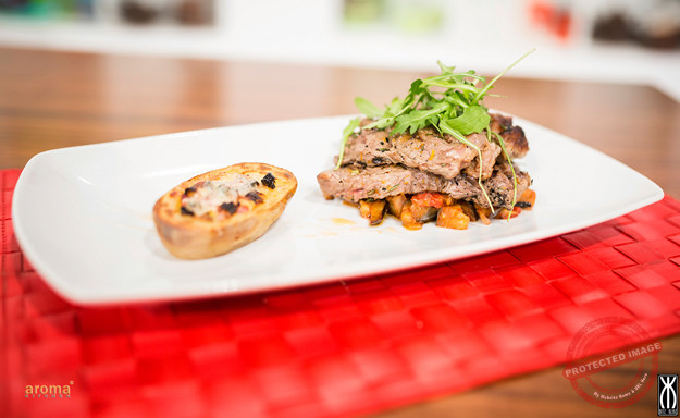 Mix the rosemary, zest and oil together well and rub into the beef, allow to rest for a few hours than grill of high heat to your liking. Meanwhile, cut the potato lengthwise and boil, once soft spoon a whole in the middle enough to stuff it. Dice the onion and pancetta sauté on low heat until lightly browned than remove from heat allow to cool than mix with the cheese and stuff the potato. Bake the potato at medium heat until browned. Finely dice the aubergines, onions, garlic and sauté in olive oil until softened, add the cherry tomatoes toss than pour in the juice. Simmer for a few minutes and serve underneath the beef.