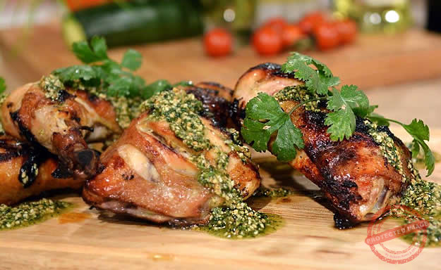 Oriental marinated chicken legs with coriander and sesame pesto