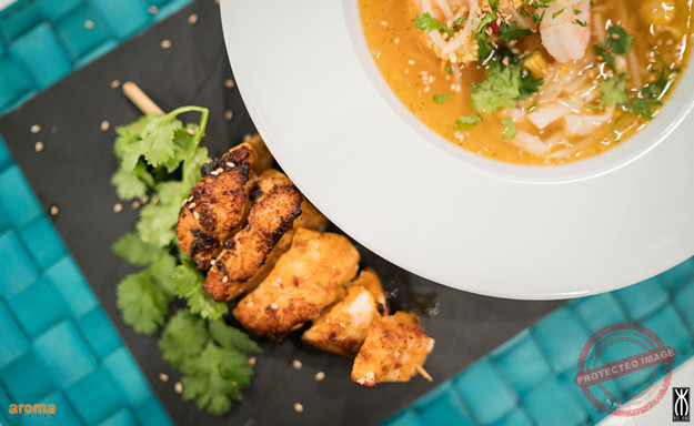 On low heat sauté the prawns in sesame oil, remove and add the chopped ginger, zest, chilli, spring onions with the sliced baby corn and carrots in the same oil used. Sauté without browning than add the fish sauce, stock and simmer for 20 minutes. Once almost cooked add the bean sprouts, coriander, spaghetti and prawns back, sprinkle seeds on top after plated. Dice the swordfish mix well with the red curry paste and insert them in the two kebab sticks, grill on a well preheated griddle pan and serve on the side.