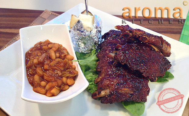 Prepare a rub with the smoked paprika, onion flakes, garlic flakes, pepper corns, cumin, cayenne, brown sugar and salt. Mix well together and rub all over the pork ribs. Massage the rub into the meat. Allow the meat to rest for 15 minutes until it starts to sweat. Next, wrap the ribs into a silver foil pocket and bake for 2 ½ hours in a moderately hot oven temp 130 °c. Take the ribs out of the foil and brush all over with the barbecue sauce. Return to a hotter oven temp 180°c for a few minutes. Brush again with the sauce and repeat the same process for 3 times until ribs are glazed and sticky. To prepare the beans simply cook the onion and celery sticks in a spoon of oil, mix in the fajita spice and stir well. Add the beans, sticky rib sauce and dark brown sugar. Bring to the boil and simmer for 10 minutes until thick. Slice the ribs and serve with the beans and jacket potatoes.