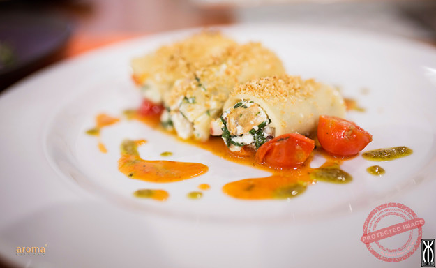 Cut, trim and wash the spinach, wilt in a hot pan with the garlic clove in hot olive oil. Squeeze and drain to remove excess water. Quick fry the seafood in olive oil, season well; mix with the sea food and the remaining ingredients. Stuff the paccheri with the obtained filling and place on a baking tray greased with extra virgin olive. Meanwhile, prepare a quick tomato sauce with the cherry tomatoes, olive oil, basil and tomato sauce by simmering all the ingredients together. In a separate pan heat a spoon of olive oil and toast the bread crumbs in, until golden, remove from heat, season with salt and pepper, allow cooling. Mix bread crumbs with the lemon zest, parmesan and herbs. Serve the warm paccheri sprinkled with the bread crumbs mix and a side of the tomato sauce.