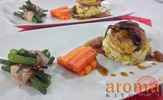 Heat a tablespoon of oil in a frying pan over a high heat. Season the guinea fowl breasts, and add them skin-side down and cook for two minutes or until the skin is crispy. Turnover and continue to cook for a further two minutes. Put in a hot oven of 180`c between 10-15 minutes. Peel and cut the potatoes into cubes, cook in a pan of simmering salted water until just tender, about 10-15 minutes, and drain. Fry the sweet corn with garlic and spring onion, Add back to the pan with the potato and some seasoning and crush lightly with a masher or the back of a fork. Set out the bacon, boil in salted water the green beans drain and cool.Lay out a half strip of bacon. Place a small bunch of green beans (4 or 5) onto the strip of bacon and roll up into a bundle. Place the bundle into the casserole dish, seam side down. Repeat with remaining bacon strips and green beans. You can pack these pretty tight in the pan; just know that if the bacon is touching another bundle they take some prying to get apart. Sprinkle with salt and pepper. Bake in the preheated oven until browned and heated through, about 5-10 mins. Peel the carrots and cut into strips of 4 cm long, boil in salted water and drain. Add orange juice, brown sauce, and tarragon to the hot skillet. Cook until reduced by about 3/4 (sauce should coat the back of a spoon). Right before serving, whisk in the butter. Season with salt and pepper to taste.