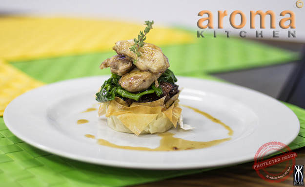 In a well preheated pan shallow fry the quails until well browned from both sides, add honey allow to start to caramelise than add liquer stir and remove from heat. Using a mould prepare a filo basket brushing each layer of filo wth melted butter and bake until brown and crispy. Start the compote by cutting the onion in chunky pcs and pan fry in butter and oil until softened, add garlic, thyme and fig cut in halfs and toss for 1 minute. Now pour in the red wine and allow compote to bind. Serve the compote in the filo case with sauteed spinach in butter on and quails on top drizzled with the honey and prickly pear reduction.