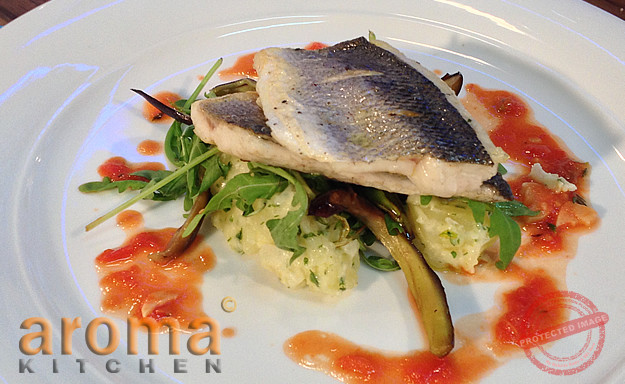 Pan-fried Sea bass with tomato and thyme coulis and crushed wasabi potatoes