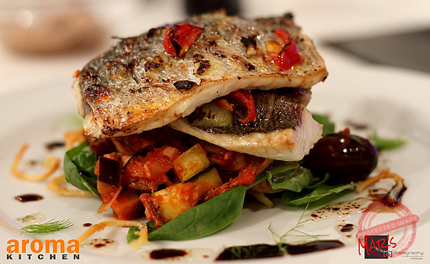 Pan fried sea bream on a tuna and olive caponata rosemary pasta cake