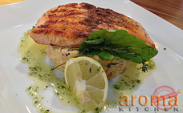 Pan-seared salmon fillet on king prawn risotto