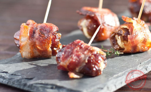 This recipe is extremely easy. Stuff each pitted date with a piece of walnut, wrap up in the bacon or pancetta and place onto baking tray. Bake in the oven at 200`c for 10-15 minutes or until crispy and golden brown. Serve whilst still hot.