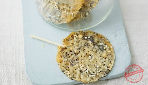 Mix together the Parmesan and seeds in a small bowl. Place non-stick paper on 2 baking sheets. Place a 10cm round cutter on the sheets and fill with a thin layer of the cheese mixture. Remove the cutter, lay on a lollypop stick, and cover the stick with a little extra cheese. Repeat the process with the remaining cheese mixture, then bake in the oven for approximately 10 minutes at 200`c, or until golden brown. Remove from the oven and allow to cool down completely before removing and serving.