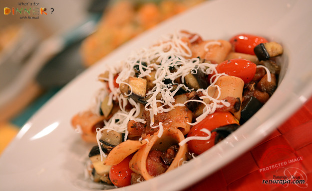 Start this recipe by heating the oil in a large frying pan and cook the aubergines for 10 minutes to soften. Season well with pepper and salt then add in the garlic and fry for 2 minutes. Add in the tomato puree and cook for a minute before adding in a splash of red wine, sugar, Italian herbs and polpa. Turn down the heat and cook for 5 minutes before adding in the cherry tomatoes and sliced black olives. Cook for another 5 minutes only before stirring in chopped basil leaves. To serve, fill 2 pasta bowls with the orecchiette pasta and serve over the aubergine sauce. Spoon over a little grated ricotta salata and serve decorated with fresh basil leaves and a drizzle of oil.