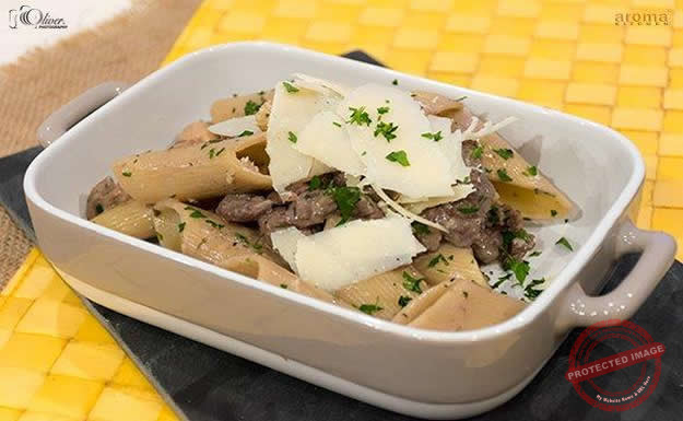 Start this recipe by heating a little oil in a frying pan and quickly sear the beef strips. Remove from the pan. Add in the garlic, onion and thyme and soften together for 5 minutes. Splash in the wine to evaporate, then add in the beef stock, cream and mushrooms and reduce. Add the beef back into the pan and continue to cook for 3 minutes until cooked through. Stir in the chopped parsley and tartufo butter and mix the sauce with the cooked pasta shapes. Serve topped with Parmesan shavings.