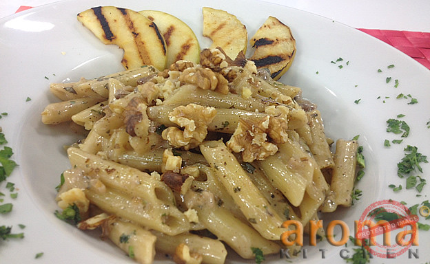 Boil pasta accordingly to instructions and set aside. Slice the apple and grill on high heat, put in a pan the walnuts together with the garlic and oregano. Add the white wine, blue cheese and vegetable stock and simmer, add the cream and simmer once again. Season the pasta sauce, add the pasta, toss and serve with the grilled apple and some more crushed walnuts.