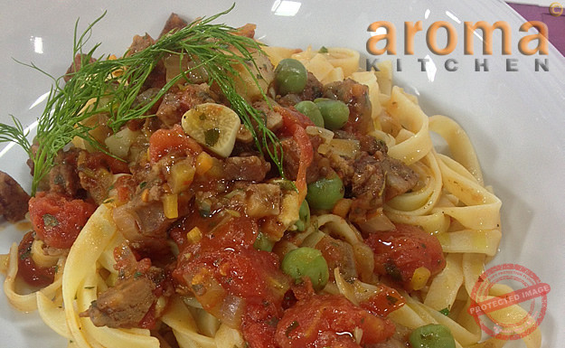Pasta with Maltese sausage, peas, artichoke hearts and tomato sauce