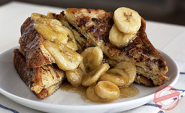This is a very easy recipe to prepare. Spread the 4 slices of bread with the peanut butter on 1 side. Lay the sliced bananas on 2 of the slices and sprinkle over the cinnamon. Cover with the remaining slices, peanut butter side down. In a deep dish, whisk together the eggs, milk, vanilla and maple syrup or honey. Heat up a large frying pan and melt in the butter. Quickly, dip the 2 filled sandwiches into the egg mixture on both sides and quickly fry in the melted butter in the pan. It should only take a couple of minutes on each side if the pan is hot enough. Remove from the pan, cut the sandwiches in half diagonally and serve with extra cinnamon, maple syrup or honey.