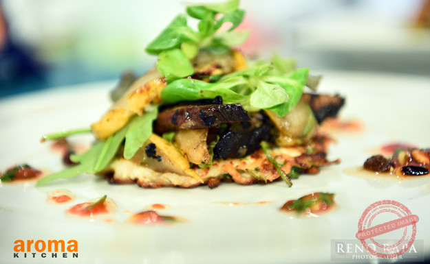 Slice the Pear, sprinkle sugar on and grill until browned. Slice the oyster mushrooms, leeks and sauté, season remove from heat and in a bowl mix with the raisins, pear and allow to cool. Sauté the spinach in garlic oil and mix with the cold cooked rice, ricotta, egg and mint. Form 2 patties and shallow fry on a non stick pan, season and dust with flour if needed. mix well the polpa, nuts, parsley and olive oil to use as a dressing. mix the lettuce with the mushroom mix and serve on the patty drizzled with the dressing around the plate.