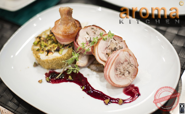 Pear and sage Stuffed leg of chicken with a pistachio and goat cheese cake