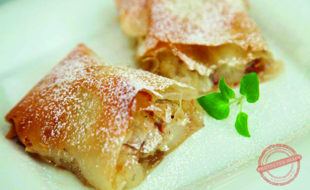 Start this recipe by cooking the pears. Place them into a pan with the 20g butter, 1 tbsp sugar and sultanas and cook down for 5 minutes. Take off the heat and cool down before mixing in the cold custard and a good pinch of cinnamon. Lay out 1 filo sheets and brush with a little butter. Cover with another sheet of filo. Place 2 heaped tbsp of the pear filling at 1 end, fold in the sides then roll up (like a spring roll)Repeat with the remaining filo and filling. Place the strudels on a greased baking sheet, brush lightly with butter and sprinkle over the flaked almonds. Bake at 200`c for approximately 20 minutes. Remove from the oven and serve dusted with icing sugar and a sprinkle of cinnamon.