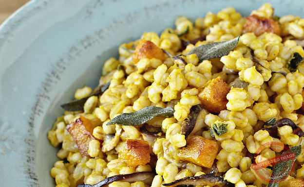 Pearl barley and pumpkin risotto with sage and white dried gbejna