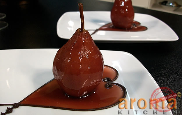 Put the port, sugar and spices together in a saucepan (just big enough to fit the 6 pears standing up) and heat up till you prepare the pears. Using a potato peeler, carefully peel the skin off the pears, making sure to leave the stem on the top. If the pears do not stand up, slice a small piece off the bottom. Stir the warmed port, and then put in the pears, standing up, side by side. Reduce the heat and simmer the pears for 30-45 minutes till soft. (Cooking time may vary depending on how firm the pears are)You can check that the pears are cooked by sticking in a sharp knife. If the flesh is soft, they are cooked. The pears will now have taken on the colour of the port, and will be deep burgundy colour. Remove the pears, cinnamon sticks and cloves from the port and put aside. Next, you will need to thicken the port. Take 2 teaspoons of arrowroot and mix them in a small bowl with 1 tablespoon of water. Put half the port mixture back on the heat and add the arrow root, whisking constantly. The port should begin to thicken to a nice glossy sauce as it heats up. Turn off the heat, and put the pears back into the sauce to glaze them. They are now ready to be served. Place the warm pears individually on serving plates and drizzle the thickened port sauce around them on the plate. Alternatively, the pears poached in spiced port can be served chilled with a scoop of ice-cream for a more refreshing dessert.