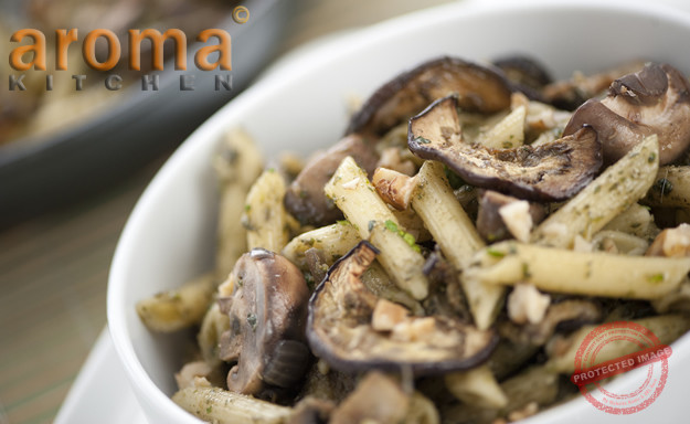Penne with grilled aubergines, mushrooms and walnut pesto
