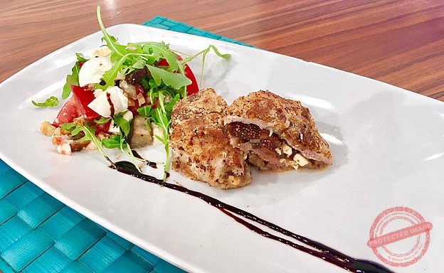 Chop the onion, fig and sauté in butter until softened, place the mixture on the sliced veal sprinkle with goat cheese and roll. Blend the bread into bread crumbs, add the chopped rosemary and season. Brush the veal with mustard and then cover with the bread crumbs. Sauté in salted butter and finish in the oven until cooked through. Cut the aubergine in cubes toss with olive oil and roast until browned. in a bowl mix the diced tomatoes, mozzarella, walnuts, rocket, chopped parsley and also the aubergine. Finally season with chilli oil salt, pepper and serve on the side with the veal.