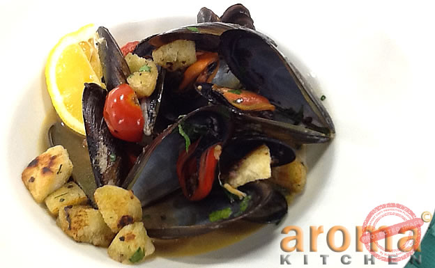 In a mixing bowl, combine all the mussel ingredients except for the fish stock. Put in a hot frying pan and cook for 2/3minutes. Add fish stock and leave on heat until mussels open up. For the garnish, combine the garnish ingredients in a mixing bowl, and then roast then on a low heat in a hot pan. Serve the mussels garnished with the anchovy croutons.