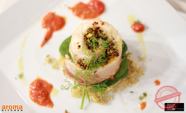 Start this recipe with the tomato jam. Sauté the chopped shallot with a tbsp of olive oil and add in the cherry tomatoes. Cook for a minute, then add in the sugar, balsamic vinegar, sugar, stock and season well with salt and pepper. Reduce the heat and allow to cook down for 15 minutes. Meanwhile prepare the fish. Place the breadcrumbs in a food processor with the basil and parsley leaves and blitz together with a good glug of oil and the sun-dried tomato pate`. Place the fish onto a tray and season well with pepper. Press on the crumb mix and roll up tightly. Drizzle over a little more oil and bake in the oven for 10-15 minutes. You can now make up the tomato couscous with hot water and stir in the toasted pine nuts. To serve, place the couscous into 2 rings on 2 serving plates. Carefully place on the olive crusted perch and dress with a few salad leaves on top. Spoon the tomato jam around the edge of the plate and serve.