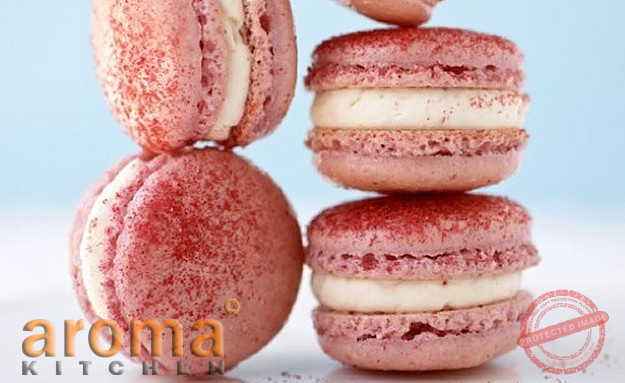 Place the icing sugar and ground almonds together in a food processor and pulse for 20 seconds. In a large clean bowl, whisk the egg whites to stiff peaks, then gradually stir in the caster sugar, a tablespoon at a time. Fold in the vanilla essence, followed by a few drops of red food colouring. Next, fold in 1/3 of the ground almond mixture, followed by the remaining 2/3 till you obtain a light, smooth mixture. Pipe the mixture onto a baking sheet covered with non-stick baking paper, slightly apart from each other. Leave to rest for 30 minutes before baking in the oven at 160`c, for 15 minutes only. Meanwhile, prepare the butter cream filling. Mix the butter with the vanilla essence till light. Add in the icing sugar and mix together to a smooth cream. When to macaroons have cooled down completely, sandwich them together with the vanilla butter cream and serve.