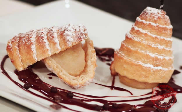 To make the poached pears, heat all of the pear ingredients in a small saucepan and pop in the peeled pears. Cook for 15 minutes or until the pears are cooked through. Allow to cool and remove from the syrup. Next, roll out the puff pastry and cut into strips. Wet the strips with a little water and use to wrap around the pears, starting from the top and tucking in the end piece at the bottom of the pear. Lightly wet the puff pastry again and sprinkle the caster sugar over the pears. Place onto a baking tray lined with non-stick paper and bake in the oven for 25 minutes. Meanwhile, to make the chocolate sauce, heat together the dark chocolate and the cream melt the chocolate and remove off the heat stirring constantly. To serve, dust the pears with icing sugar and pour over the chocolate sauce.