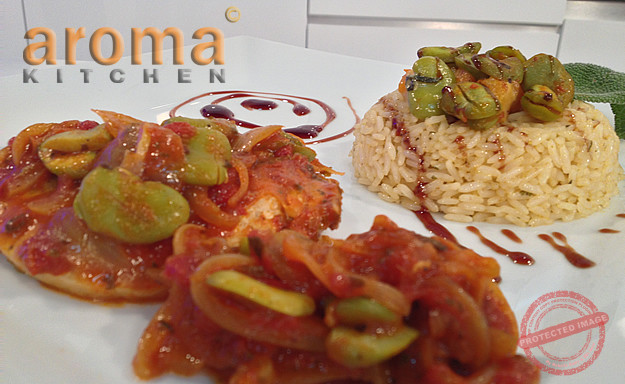 Pork chops with tomato and fava bean sauce (Gluten-free)