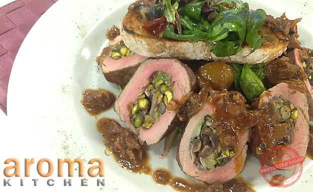 Pork fillet stuffed with pistacios, mushroms and spring onions
