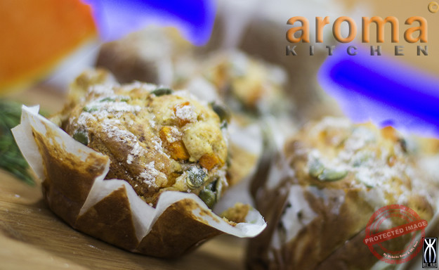 Line a 12-hole muffin tin with 12 baking paper cups. Start this recipe by cooking the pumpkin together with a tablespoon of butter substitute until the pumpkin is soft. Remove off the heat and allow to cool. Meanwhile, sift the flours, baking powder, bicarbonate of soda and salt into a large bowl. (Reserve any wholegrain left in the sieve.) Meanwhile in another bowl, mix the eggs, yogurt, milk, honey, 60g butter substitute and chopped rosemary together until well combined. Pour the wet ingredients into the dry and fold together, but be careful not to over-work the mixture. Stir in most of the pumpkin, reserving a little for the top of the muffins. Spoon the mixture into the muffin cases. Sprinkle the reserved wholegrain over the top of the muffins, the remaining pumpkin and the pumpkin seeds. Bake in the centre of the oven at 200`c, for 20–25 minutes or until the muffins are well risen and a skewer inserted in the centre comes out clean.