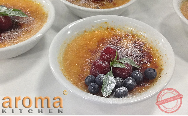 Warm the cream and vanilla until it reaches 85°C. In a bowl mix the eggs and sugar, mix without making foam and bubbles, add in the pumpkin puree. Scrape the vanilla and take all its goodness in the cream and pour it on the pumpkin mix, fold and pour the mix in 6 brulee’ ceramic containers, bake bain-marie in a hot oven 170°C for about 45 mins of until it sets and wobbly in the middle, leave to cool for about 2 hours and sprinkle with sugar, burn with a blow torch until caramelises, serve immediately.