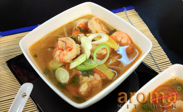 To make the soup, heat the oil in a large saucepan, and quickly fry the tiger prawns for just a minute to half cook them. Remove the prawns from the pan and put aside. In the same pan, add the sliced garlic, ginger and chilli and fry together for 2 minutes. Add in the fish stock and ½ cooked prawns and turn down the heat. Continue to cook the soup for just 3 minutes more. When you are ready to serve the soup, stir in the lime juice and coriander leaves. Divide the bean sprouts equally amongst 2 deep bowls and pour over the hot and sour soup. Sprinkle over the sliced spring onion and serve immediately.