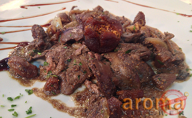 Heat some oil in a frying pan, and seal the livers, adding the vinegar just before pulling them out. In the same pan, sauté the onions, garlic and figs, add stock and reduce. Once reduced by half, add the livers, sauté for 3 minutes, and add the port, flambé the port and serve.