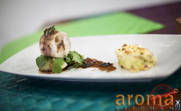 Chop the onion and garlic and sauté with the cumin until onion is softened mix with the mince, sage, egg and chopped sage. Fill the middle of the saddle and roll into a roulade, wrap in silver foil and roast on a baking tray for approximately 35minutes. For the sauce, chop the garlic and brown in salted butter, add thyme than pour in wine, stock and reduce by half. Next, boil the potato until softened and mash together with the salted butter and 2 tbsp cream until a smooth texture. Shred the cabbage and oyster mushrooms, dice the pancetta and mix together with the egg and 50ml fresh cream. Place in a deep mould and bake until binded.