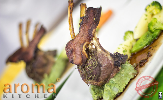Rack of Lamb with garlic port wine jus on pea puree
