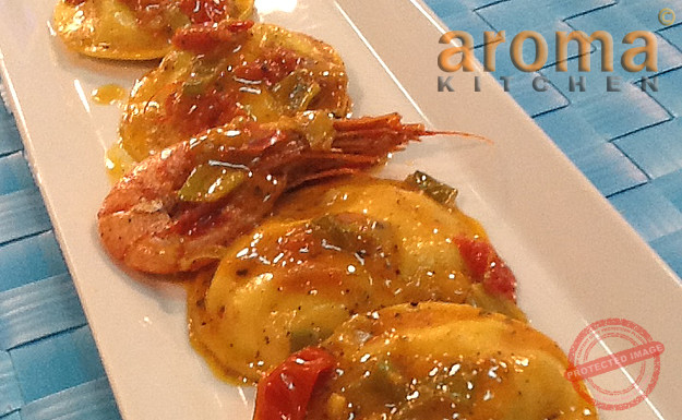 Put the butter, prawns, dill, mint, garlic, tomato and onions in a pan and cook for 1 or 2 minutes till soft. Add in the wine and stock and continue to cook. Meanwhile, cook the ravioli in salted boiling water and serve with the prepared prawn sauce.