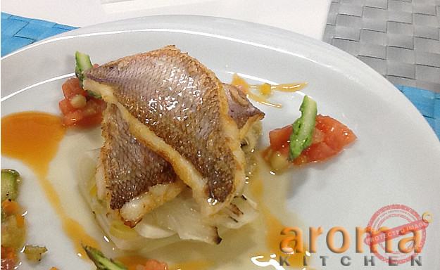 Start by filleting the red snapper and remove any bones and scales. Prepare a marinate in a bowl by mixing together some olive oil, orange zest, orange juice, fish stock and white wine. Brush over the fish on both sides for flavour. Next, use the same mixture to braise the chicory in the oven for 30 minutes at 160`c. Finally, cook the red snapper fillets in a hot, non stick pan for just 2 minutes on each side and serve with the braised chicory.